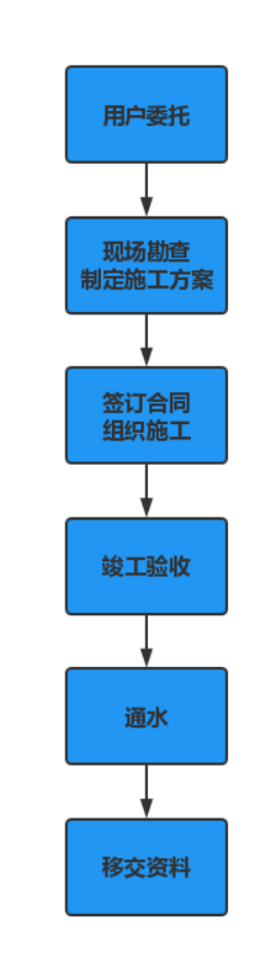 二、用戶委托---建設工程有限公司現場踏勘---供水施工方案---簽訂合同---建設工程有限公司組織安全文明施工---竣工第三方驗收---通水---移交(供水設施及技術檔案)